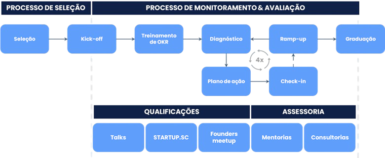 A jornada tem duração de 24 meses. Durante esse período, a startup participa de encontros presenciais, mentorias, workshops, consultorias e eventos de rede. O processo é acompanhado por diagnósticos de maturidade, metas trimestrais (OKRs), check-ins mensais e ramp-ups semestrais. A jornada termina com uma banca de graduação e direcionamento para a próxima fase de crescimento do negócio.